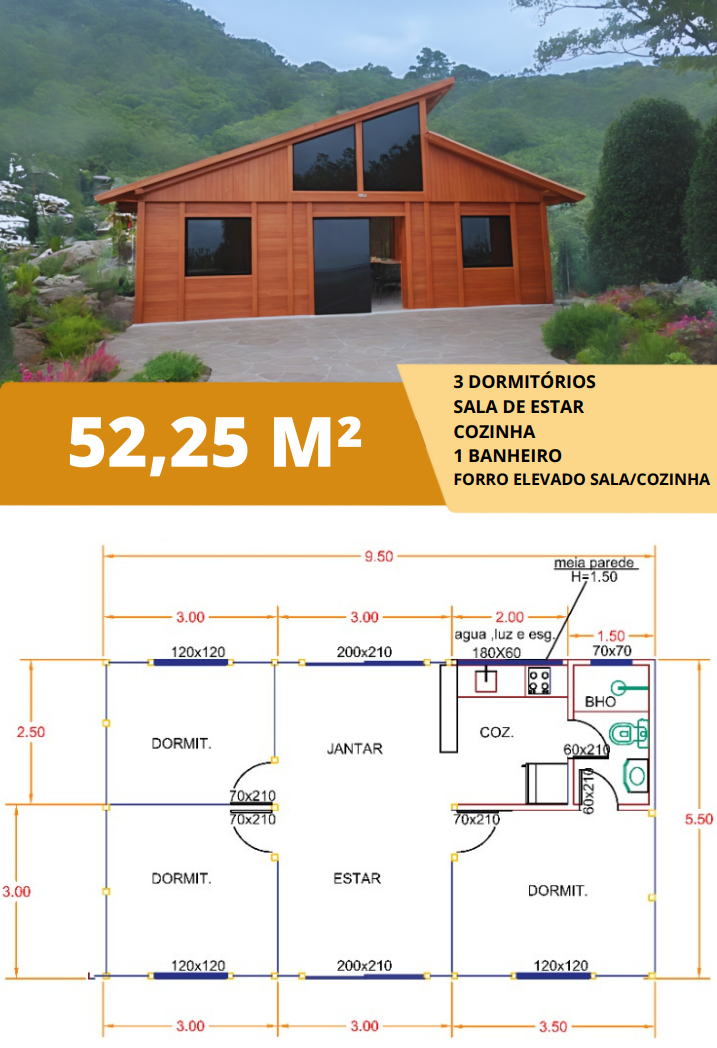 Conheça a Casa de Madeira de 52,25m², um projeto que oferece o espaço ideal para acomodar sua família com conforto e estilo. Com 3 dormitórios, sala de estar, cozinha, banheiro e um charmoso forro elevado na sala e cozinha, esta casa proporciona um ambiente acolhedor e funcional.