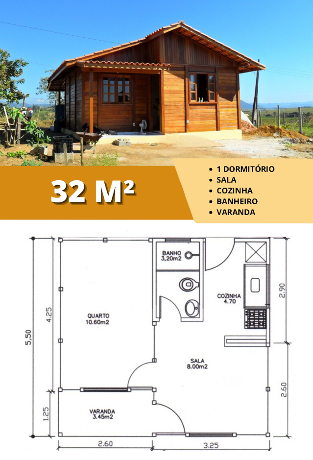 Conheça o Chalé de 32 metros quadrados, perfeito para quem busca um lar compacto, mas com todo o conforto necessário. Com um dormitório amplo, sala, cozinha, banheiro e uma varanda charmosa, este chalé oferece a combinação ideal de praticidade e estilo, com espaço suficiente para viver bem.
